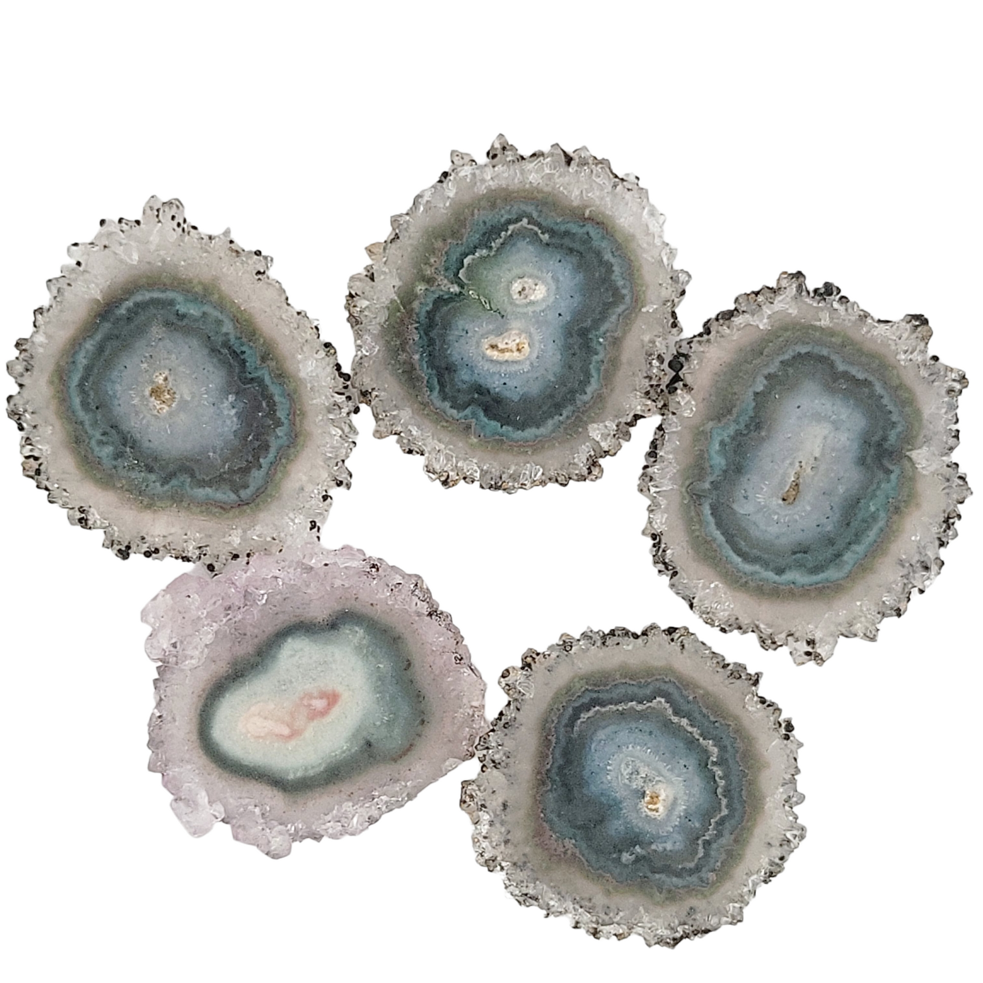 Fabulous amethyst stalactite slices with colorful agate centers, these will make lovely addition to any stone collection or altar. Size: approximately 0.5-1 inch in diameter, sold individually.