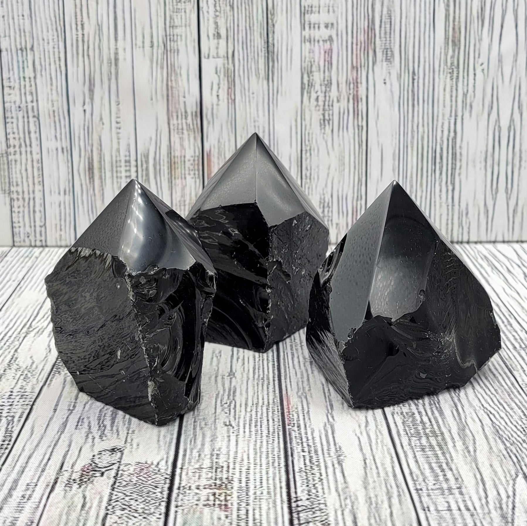 Black Obsidian is a fabulous stone for protection and grounding. These semi-polished points make an excellent addition to an altar space or for use in cleansing a space. Each point weighs between 200-300 grams, size will vary.