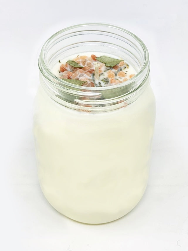 Made with pure soy wax and high quality fragrance oils. Each candle is topped with a blend of pink Himalayan salt, dried sage and botanicals of the selected scent.