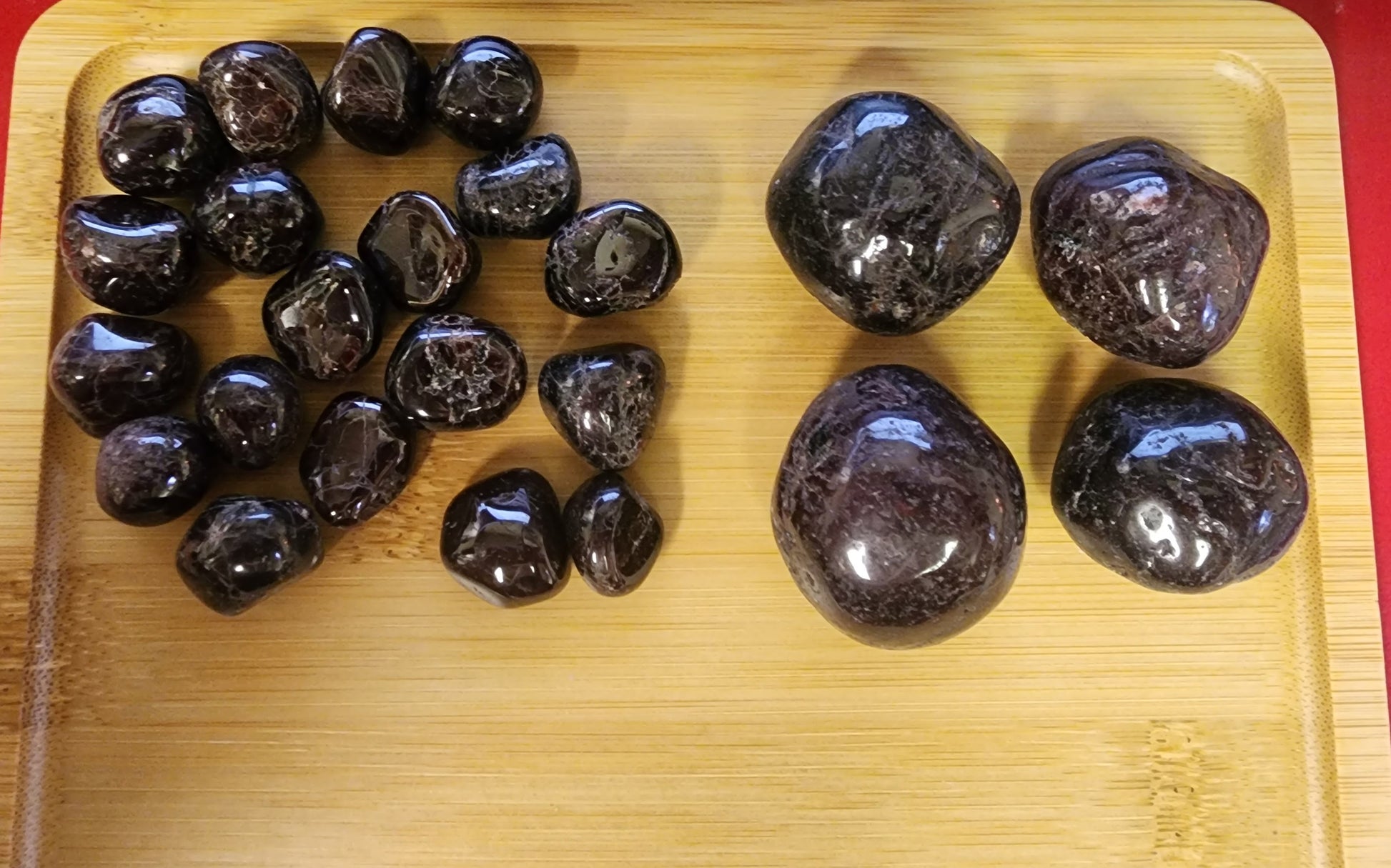 Garnet is a powerful energizing and balancing stone. These tumbled Garnet stones are quite large, most well over an inch in diameter, and most are fairly round. We currently have 2 sizes of garnet tumbles available - the third photo shows a comparison between the two sizes