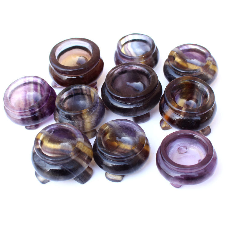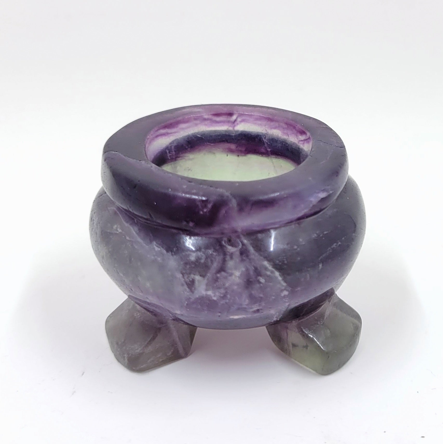 What better way to celebrate a witchy Halloween than with a fabulous hand-carved rainbow fluorite cauldron for your altar? Each piece is approximately 1.5-2 inches wide and 1-1.5 inches tall. Rainbow fluorite is highly variable in appearance, so please be aware your cauldron will not have the same patterning as the samples shown here.