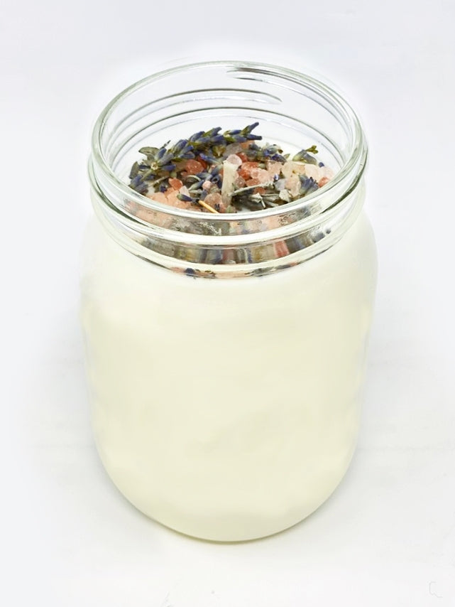 Made with pure soy wax and high quality fragrance oils. Each candle is topped with a blend of pink Himalayan salt, dried sage and botanicals of the selected scent.