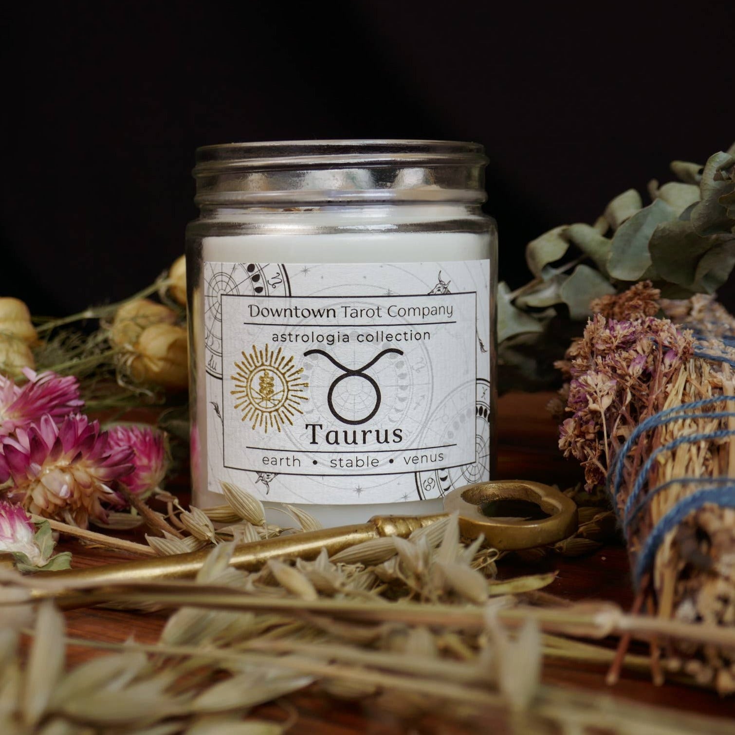 The Astrologia Collection includes an intuitively curated set of zodiac candles hand poured by the Downtown Tarot Company in Michigan. Zodiac Candles are wonderful birthday gifts and are perfect for working with an individuals sun, moon, ascendant, or any other sign in their birth chart.